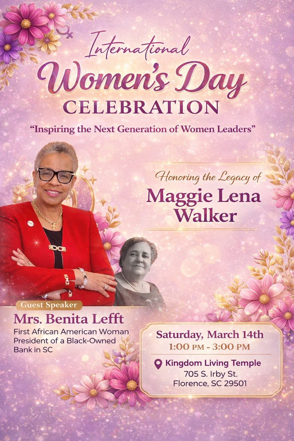 “Inspiring the Next Generation of Women Leaders” Honoring the Legacy of Maggie Lena Walker Guest Speaker Mrs. Benita Lefft First African American Woman President of a Black-Owned Bank in SC Saturday, March 14th 1:00 PM – 3:00 PM Kingdom Living Temple 705 S. Irby St. Florence, SC 29501