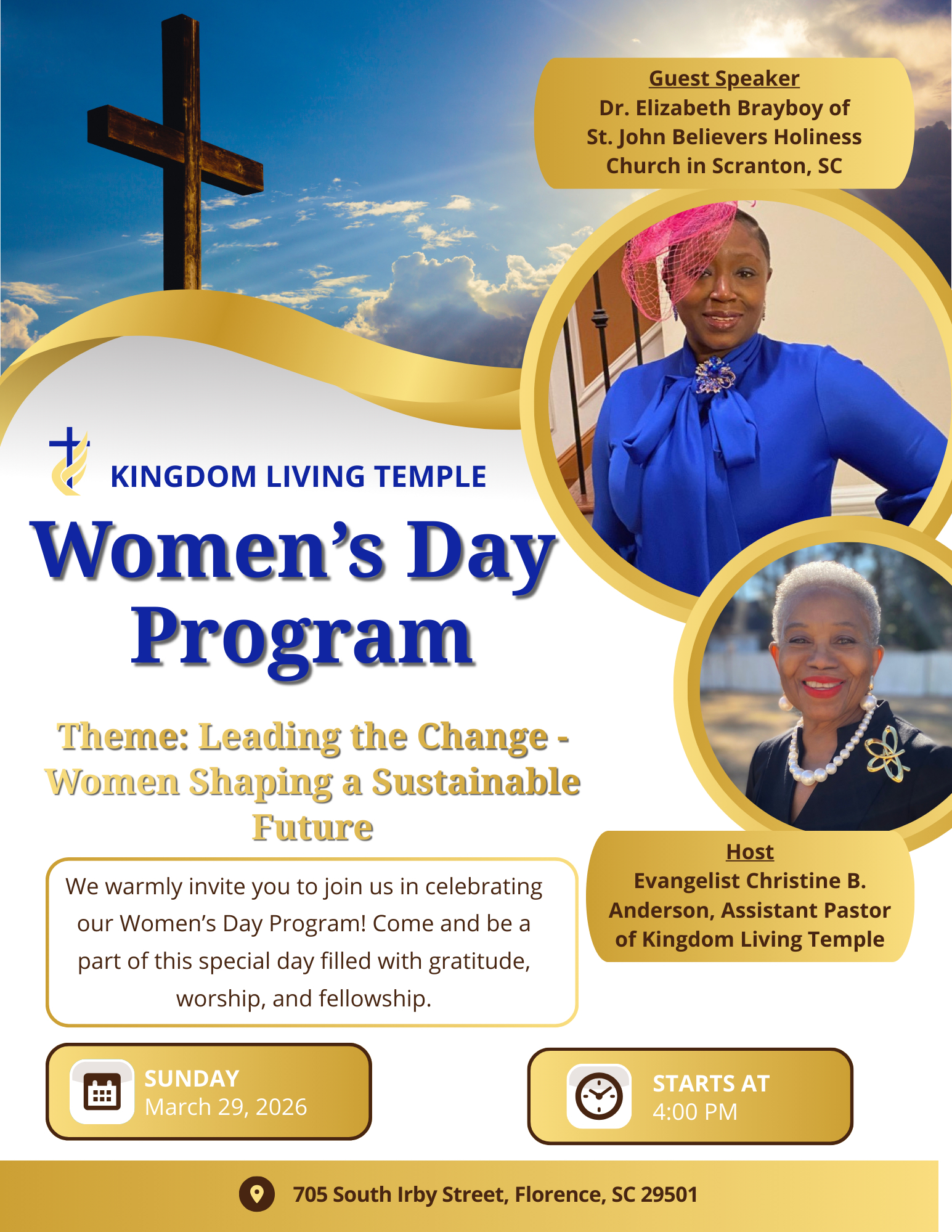 Leading the Change - Women Shaping a Sustainable Future We warmly invite you to join us in celebrating our Women’s Day Program! Come and be a part of this special day filled with gratitude, worship, and fellowship. Guest Speaker Dr. Elizabeth Brayboy of St. John Believers Holiness Church in Scranton, SC Host Evangelist Christine B. Anderson Assistant Pastor of Kingdom Living Temple SUNDAY March 29, 2026 STARTS AT 4:00 PM 705 South Irby Street, Florence, SC 29501