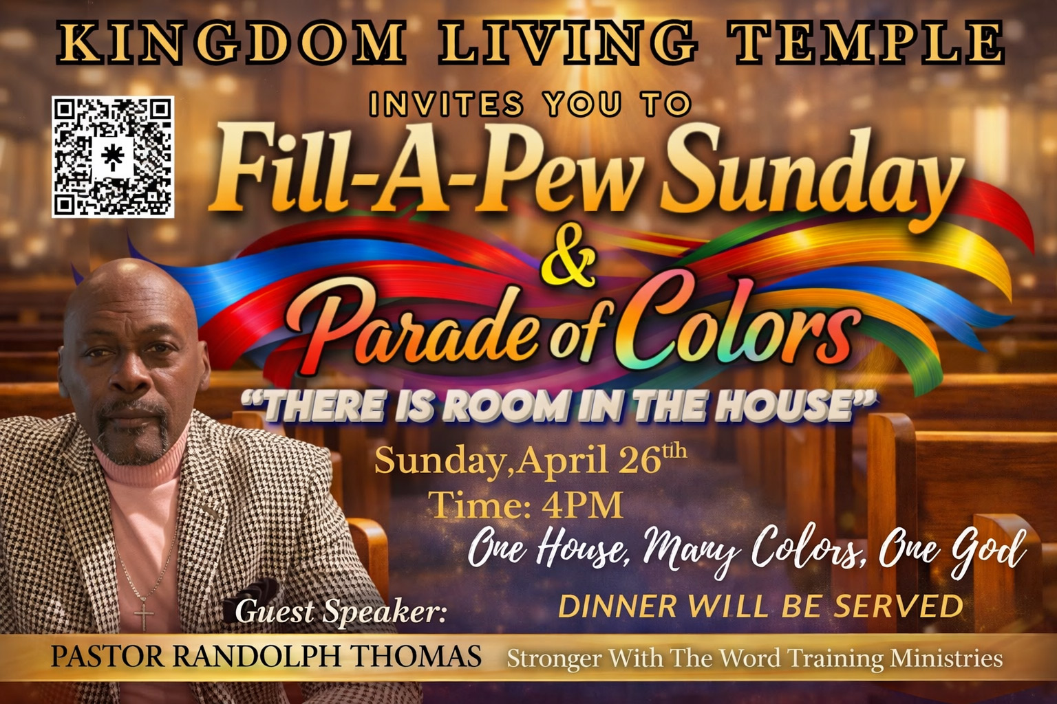 KINGDOM LIVING TEMPLE INVITES YOU TO Fill-A-Pew Sunday & Parade of Colors "THERE IS ROOM IN THE HOUSE" Sunday, April 26th Guest Speaker: Time: 4PM One House, Mary Colors, One God SUNDAY April 26, 2026 STARTS AT 4:00 PM 705 South Irby Street, Florence, SC 29501 DINNER WILL BE SERVED PASTOR RANDOLPH THOMAS Stronger With The Word Training Ministries