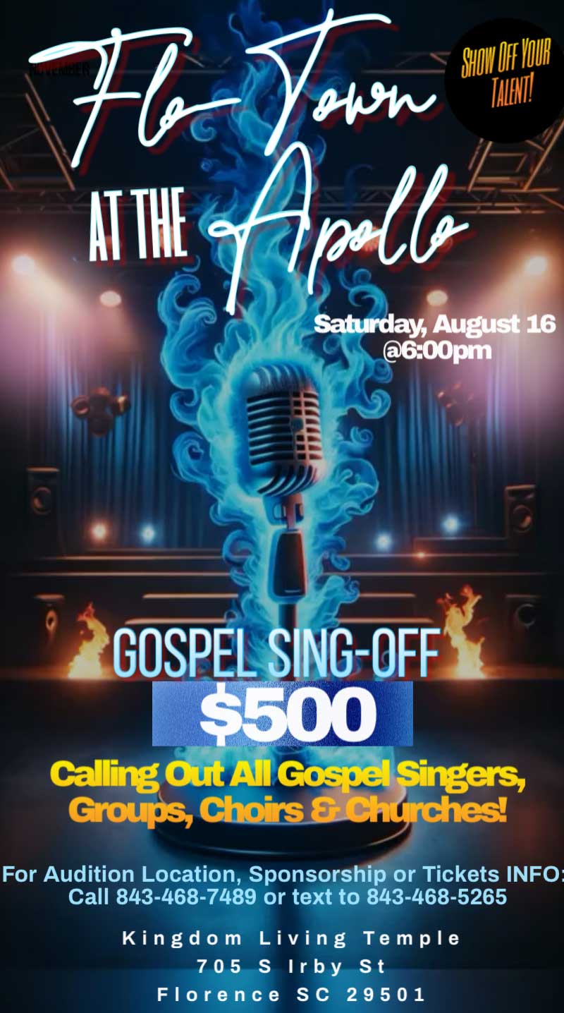 Join us for a Gospel Sing-Off Calling Out All Gospel Singers, Groups, Choirs & Churches! For Audition Location, Sponsorship or Ticket INFO: Call 843-488-7489 or text to 843-468-5265