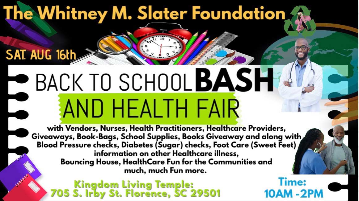 The Whitney M. Slater Foundation Back to School Bash and Health Fair With Vendors, Nurses, Health Practitioners, Healthcare Providers, Giveaways, Book-Bags, School Supplies, Books Giveaway and along with Blood Pressure checks, Diabetes (Sugar) checks, Foot Care (Sweet Feet)information on other Healthcare illness, Bouncing House, HealthCare Fun for the Communities and much, much Fun more.